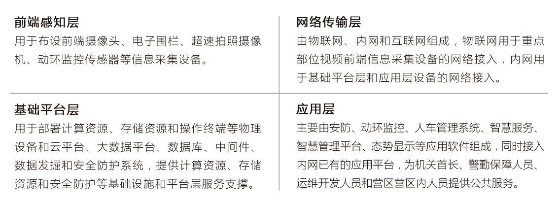 智慧軍營區(qū)分(fēn)四層架構,自(zì)底向上(shàng)為(wèi)前端感知(zhī)層'、網絡傳輸層、基礎平台層和(hé)應用(yòng)層。
